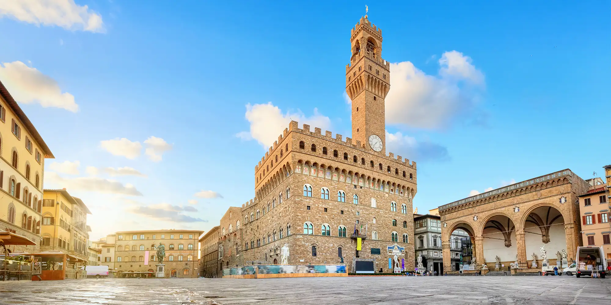 Přímo na náměstí se nachází množství soch, včetně kopie Michelangelova Davida. Prostor působí jako venkovní galerie, kde se historie prolíná s běžným městským provozem.